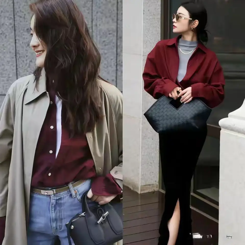 还不如直接选择一件正红色大衣外套,内搭印花的红色衬衫,加上一条红色的半身裙,脚穿杏色的短靴,就能使得穿搭者优雅得体。