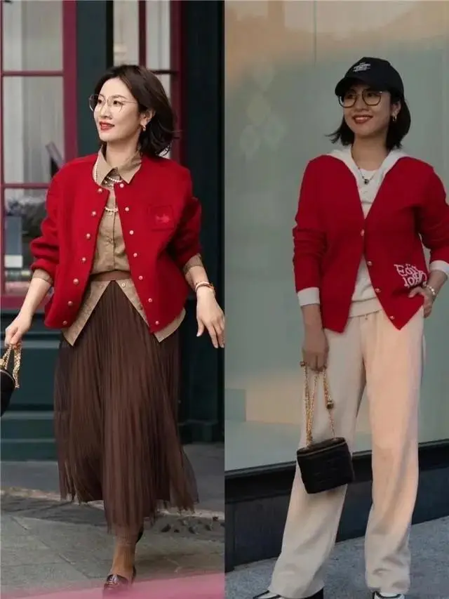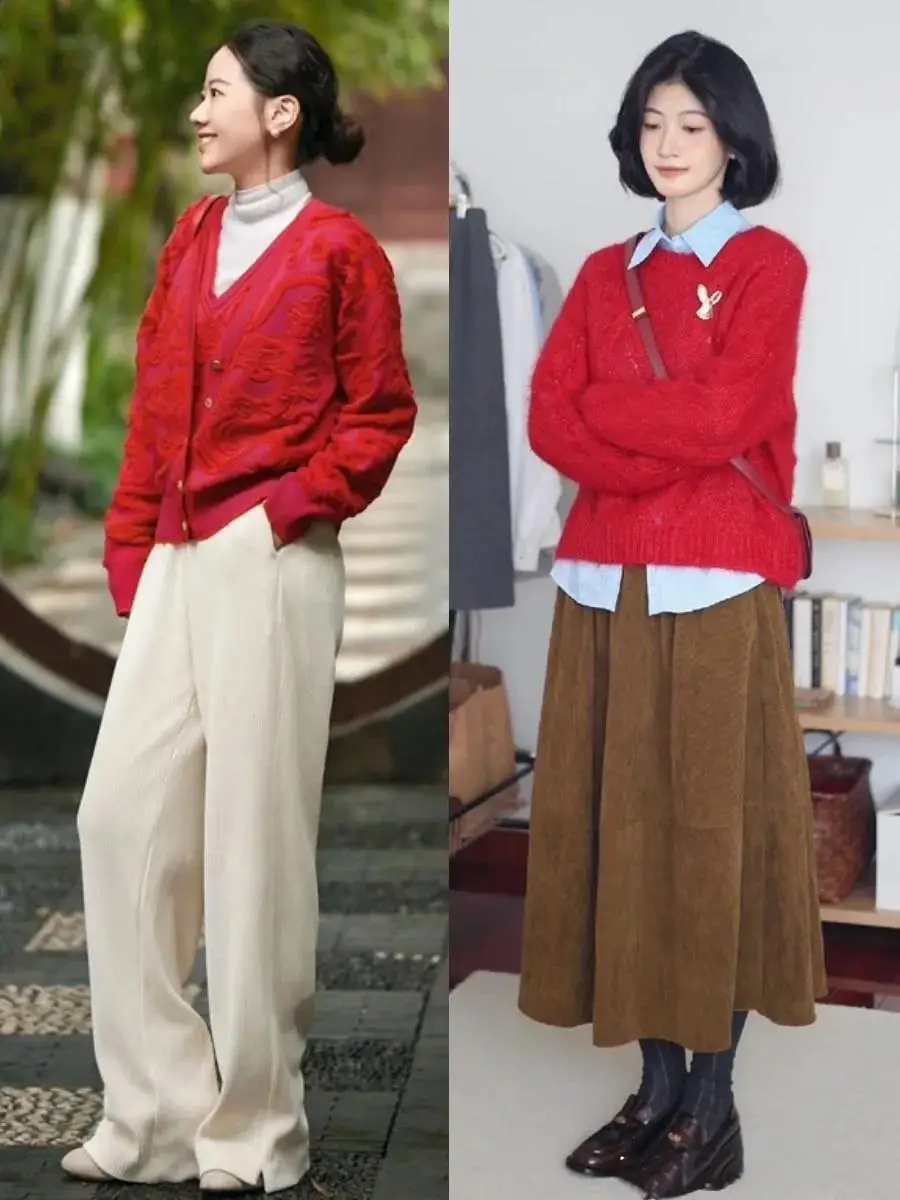 没有选择红色大衣,那么我们内搭就可以用红色的衣服单品来组合了,这样能让你的造型更有层次感,例如上面用一件红色的衬衫叠穿白色T恤,或者是灰色针织衫,瞬间让造型变得复古洋气。