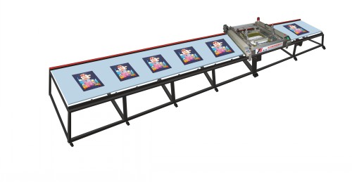 6、两条台板可循环印花,由第一条台板自动转换到第二条,收铺料不需要等待,节约时间从而提高印花效率。单台板往返运作或双台板循环操作均可以在电脑控制屏上自由设置,并可根据客户厂地而设计运行长度。