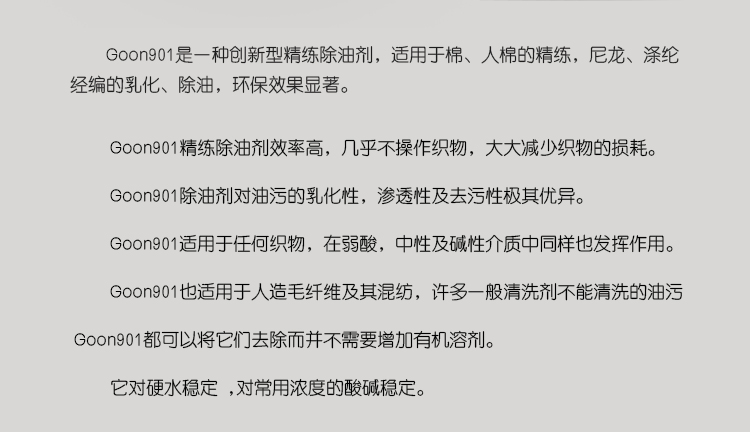 首页 > 产品供应 > 印花材料 > 东莞嘉宏纺织助剂有限公司 > 精练除油剂Goon901优异乳化性,渗透性及去污性减少织物损耗