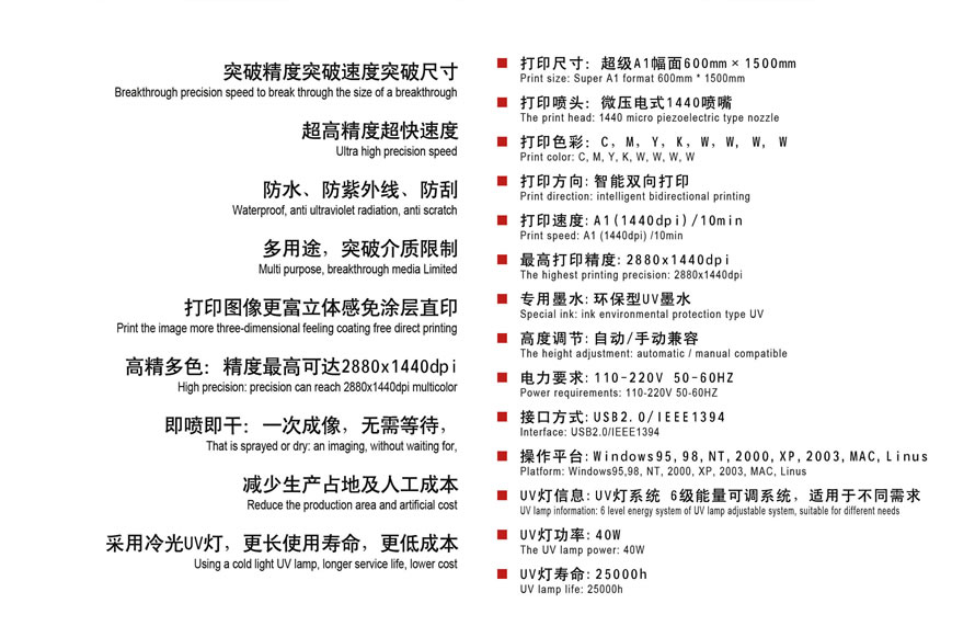 5、单件物品印制或批量生产均可,数量不限,无须制版,超低成本。像普通印花机一样操作简单,图像输入电脑即可印制,超长,加厚平台可使印制物品长度达2.5m,厚度15cm,重量达100kg。