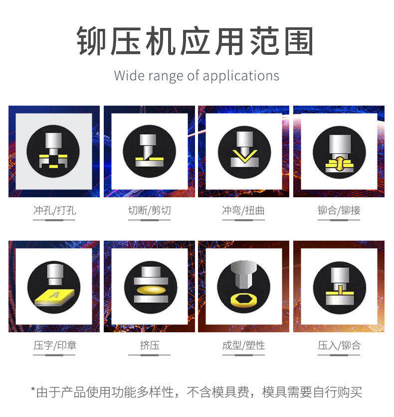 可对薄板、条料、卷材进行剪切、冲孔、落料、成型、弯曲、铆合等工序;适合有色金属,塑料件的加工。